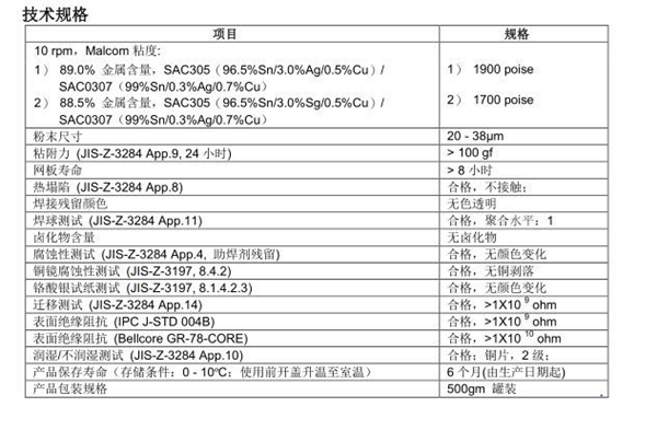 產品規格:SAC305(96.5%Sn/3.0%Ag/0.5%Cu)和 SAC0307(99%Sn/0.3%Ag/0.7%Cu